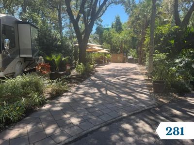 PERIMETER RV Lot #281 is BEAUTIFULLY landscaped with a paver pad that can accommodate a 42'+ coach with a tow vehicle. The mature landscaping and outstanding landscape lighting makes this lot the perfect lot for entertaining! Storage shed, table with seating for 6, two adirondack chairs, sofa and loveseat, and 2 umbrellas will convey with purchase.